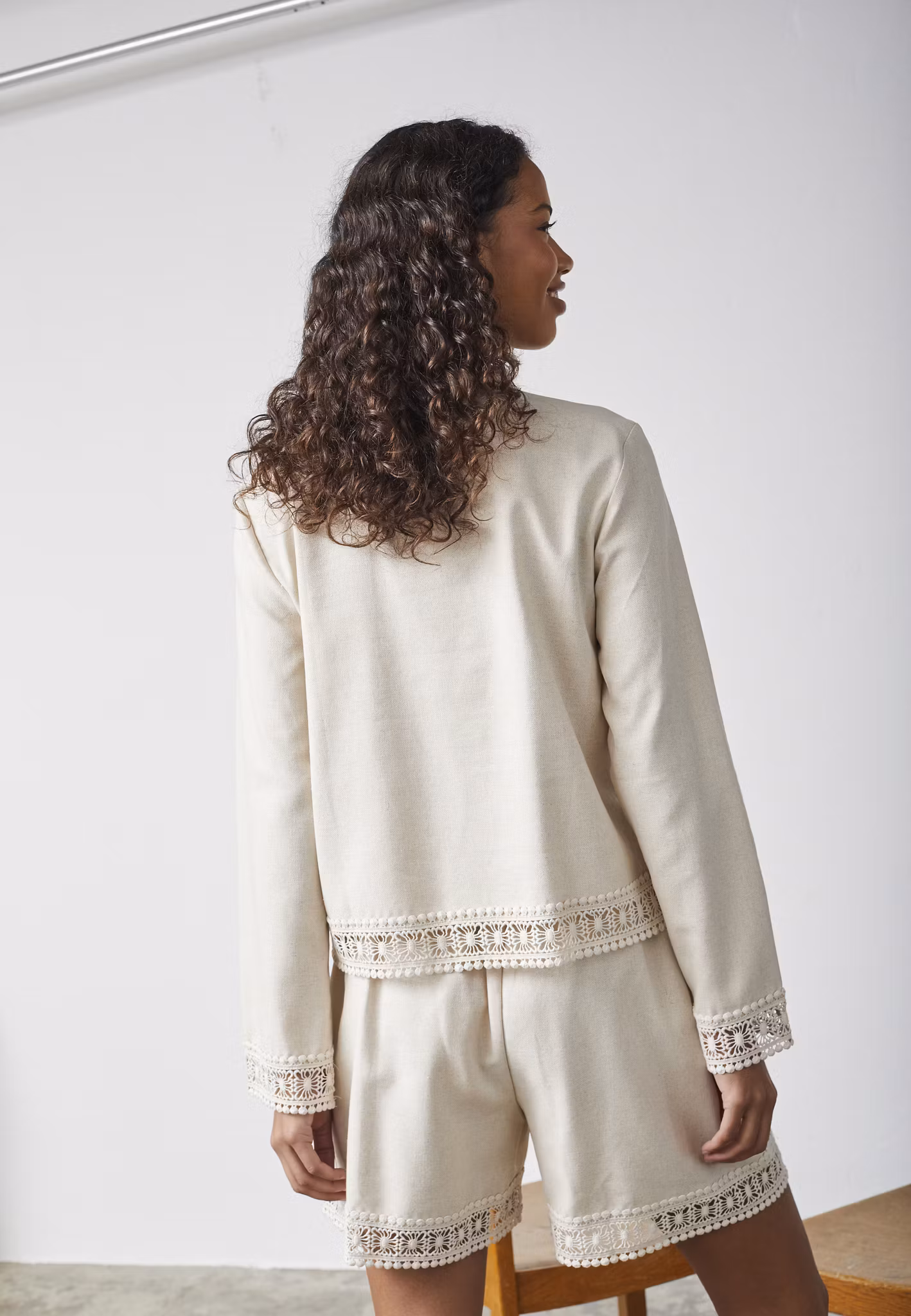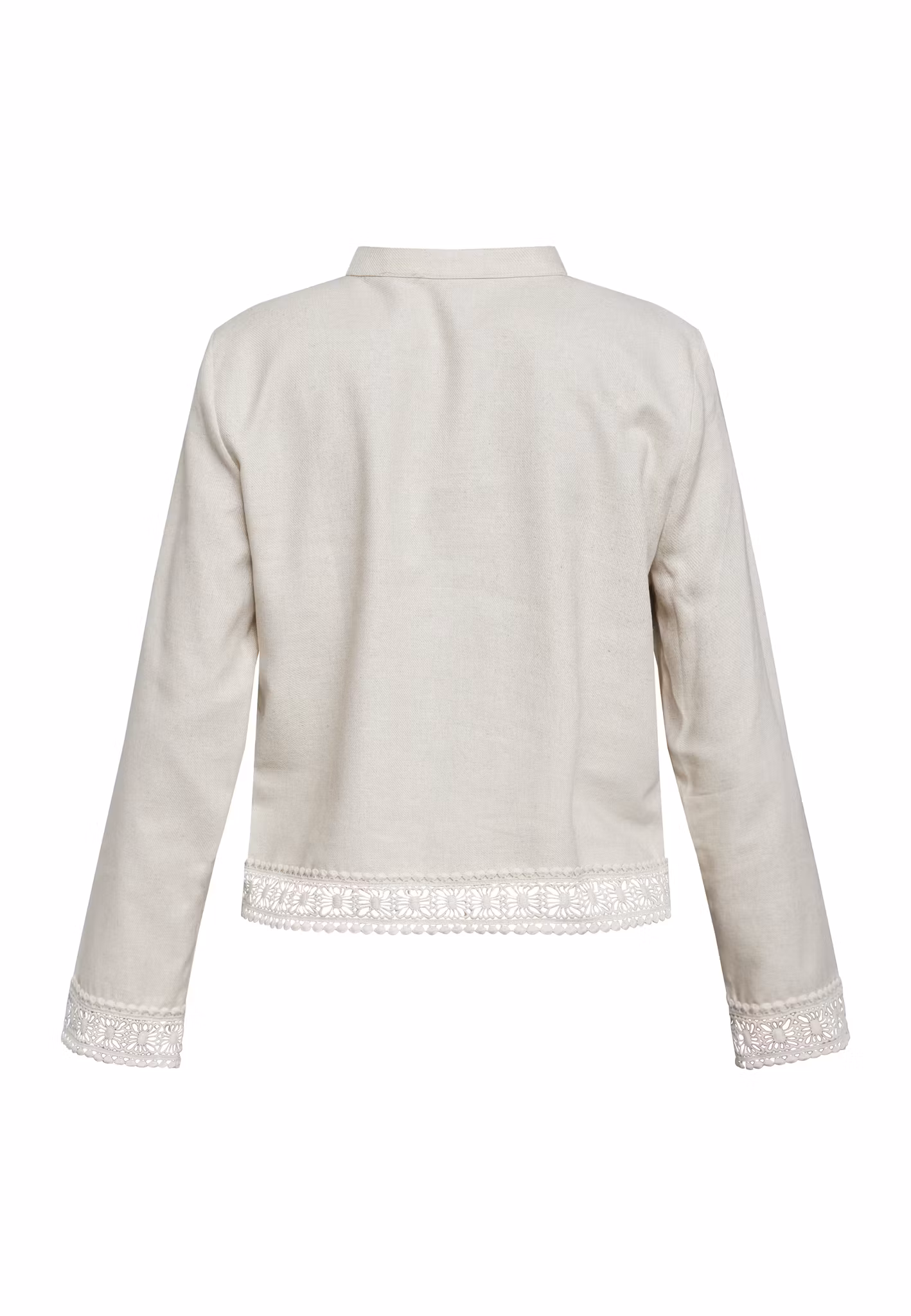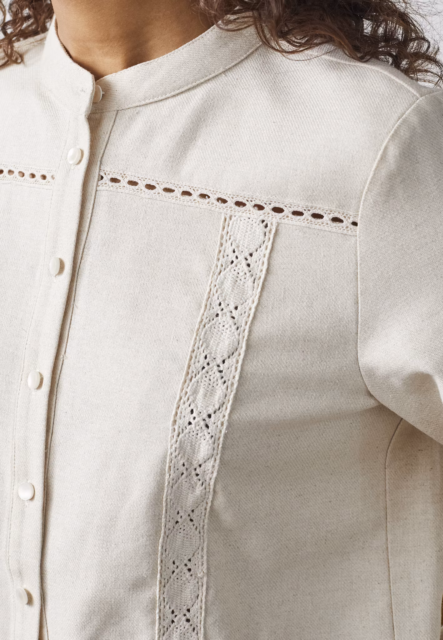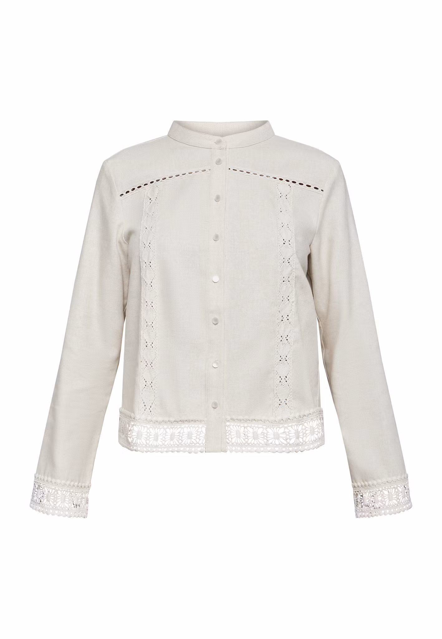 EJBA-SH är en elegant och luftig blus med ett fint, vävt mönster. Blusen har hög hals, knappar framtill och långa ärmar. Det öppna mönstret ger blusen en luftig look. Modellen har en storlek. S på.