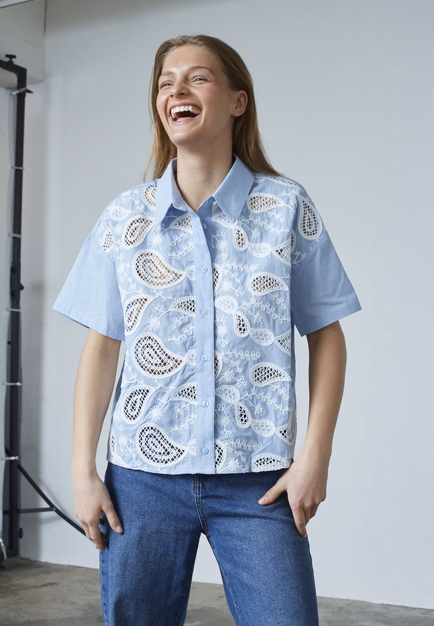 Sisu shirt 599:- Storlek XS/S M/L I lager. Lägg i korgen Lagersaldo: Artikelnummer: 2281 Leverantör: Sisters Point Dela Information Recensioner SISU-SH is a short-sleeved shirt with a classic collar and button-through closure. The shirt features decorative inserts with a lace pattern that form a paisley-like design. The model has a size S on.
