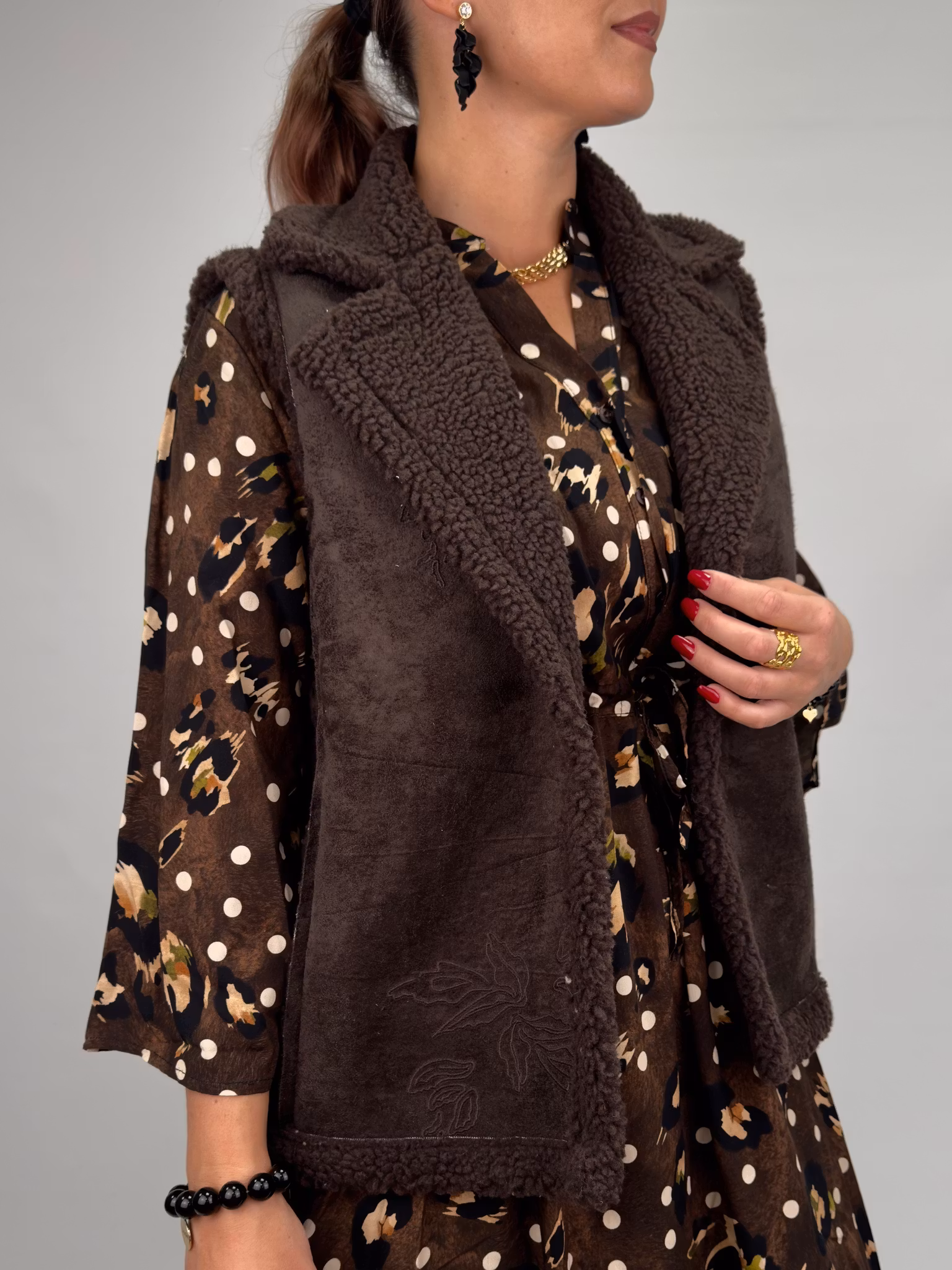 Helga is a stylish faux suede vest with cosy faux fur lining and subtle embroidered detailing. The perfect layering piece that adds both warmth and elegance to dresses, blouses and knits. A versatile favourite for all your seasonal outfits.