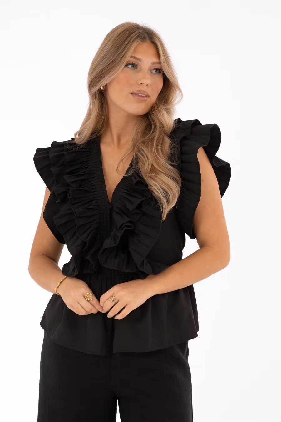 WOW – vi älskar Savoir Blus! En rockig och trendig blus med plisserade volanger som löper längs hela den v-ringade halsringningen framtill, fortsätter över ryggen och avslutas vid midjeavskärningen både fram och bak. Den peplumformade nederdelen med lätt rynk ger en smickrande silhuett, medan de plisserade volangärmarna och klädda knapparna framtill adderar en elegant och unik touch. En blus med attityd och stil – perfekt till både jeans och kjol för en trendigt feminin look.